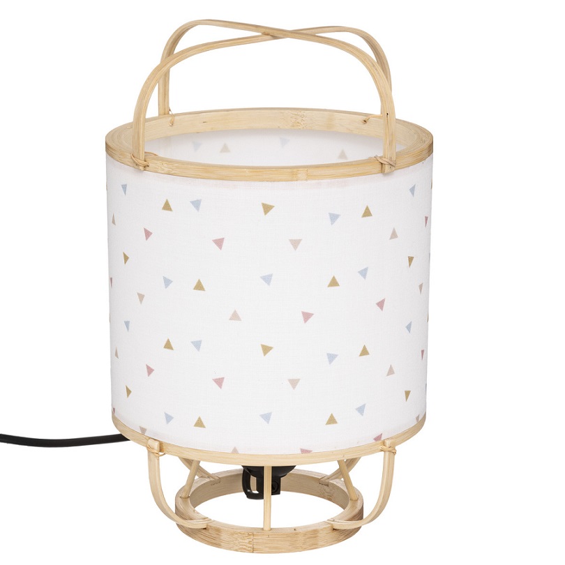 En underbar bordslampa som kommer att ge barnrummet en speciell myscharm. Vackra triangelmönster pryder den vita lampskärmen i tyg. Armaturen är gjord i bambu.Mått: Diameter: 17 cm. Höjd: 27 cm. Material: Bambu och polyester.