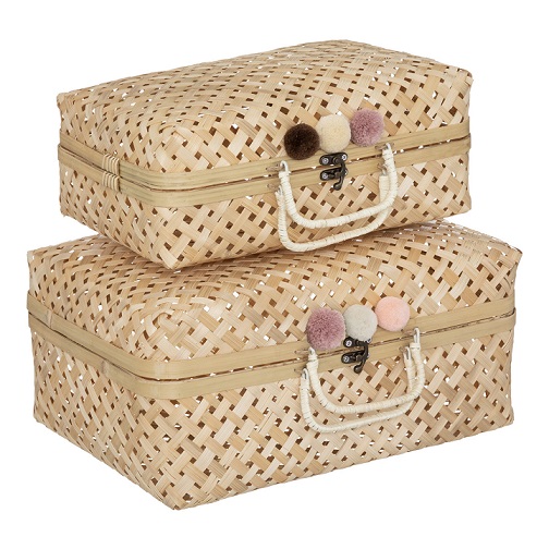 Två underbart vackra bambukoffertar med pompom i ull till barnrummet. Rymlig och smart och dessutom mycket fin för barnrumsinredningen. Varför inte placera flera på varandra och skapa ett unikt och praktiskt sängbord. Mått: Stora kofferten: 38 x 15 x 28 cm. Lilla kofferten: 33 x 11 x 23 cm. Material: Bambu och ull.