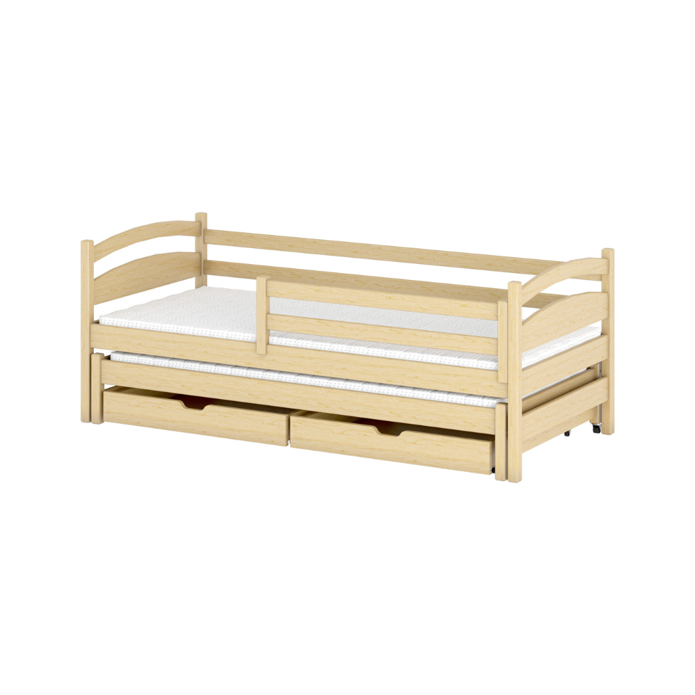 En fantastiskt fin barnsäng med en praktisk extrasäng undertill som du enkelt tar fram vid behov. Perfekt som en syskonsäng eller om en kompis vill sova över. Stödbrädan är avtagbar och sängen kan även användas som en dagbädd eller kökssoffa. Sängen är låg och får plats där det är lågt i tak, till exempel under snedtak.