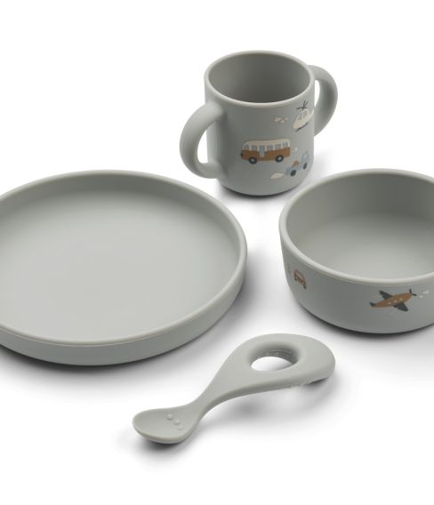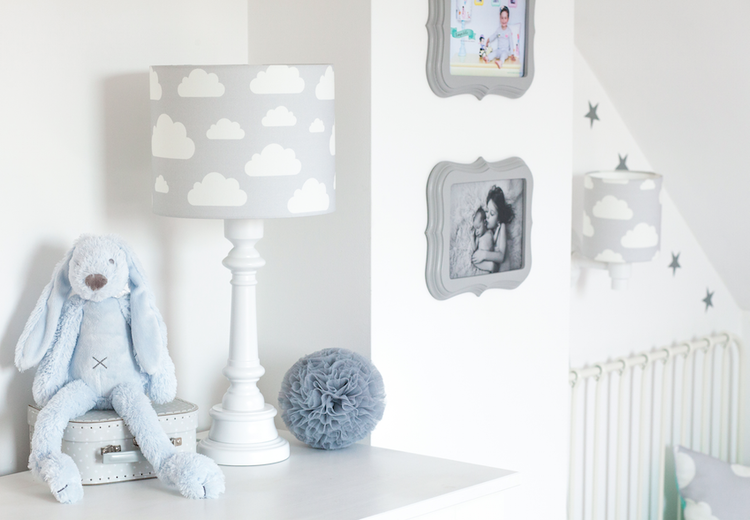 En underbar grå bordslampa till barnrummet med ett motiv av söta moln.