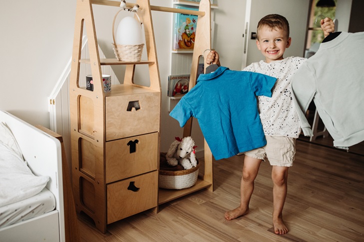 Garderoben består av en klädstång, tre stora lådor och en bottenhylla. Barnet kommer att få en känsla av att kliva in i sitt klädhus och själv välja ut dagens outfit eller varför inte använda garderoben som förvaring av ditt barns favoritleksaker?
