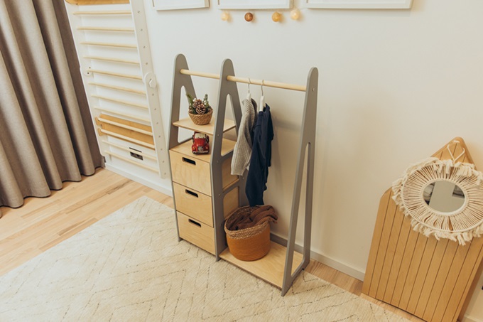 Garderoben består av en klädstång, tre stora lådor och en bottenhylla. Barnet kommer att få en känsla av att kliva in i sitt klädhus och själv välja ut dagens outfit eller varför inte använda garderoben som förvaring av ditt barns favoritleksaker?