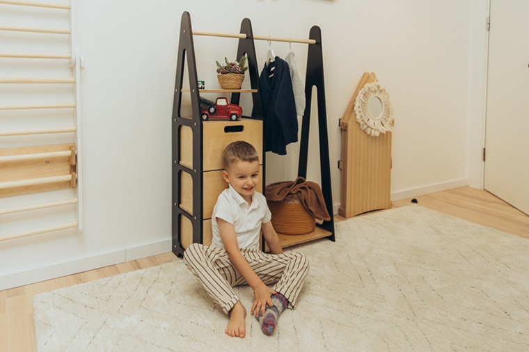 Garderoben består av en klädstång, tre stora lådor och en bottenhylla. Barnet kommer att få en känsla av att kliva in i sitt klädhus och själv välja ut dagens outfit eller varför inte använda garderoben som förvaring av ditt barns favoritleksaker?