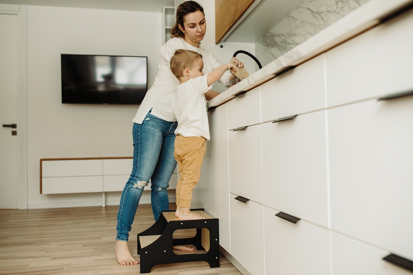 Köksstegen hjälper till när barnet ska borsta tänderna, tvätta händerna, assistera föräldrarna vid matlagning eller annan aktivitet dit minstingen (eller den vuxna) inte riktigt når upp.