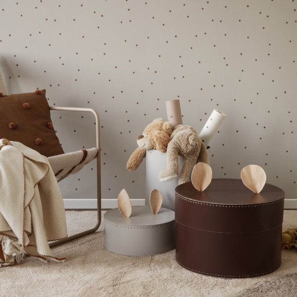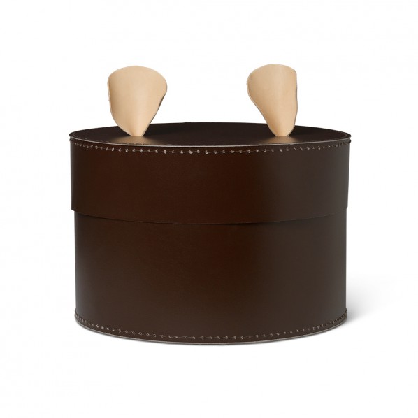Förvaring till barnrummet med det där lilla extra. Två vackra kaninöron av läder utgör handtag på locket, och skapar en känsla av nyfikenhet och lekfullhet. Detta är en produkt som man tycker om varje dag och blir det självklara stället för att förvara sina gossedjur eller favoritleksaker i. Mått: Ø40 x H26 x B40 cm Material: Kartong, LäderDesginer: Ferm Living