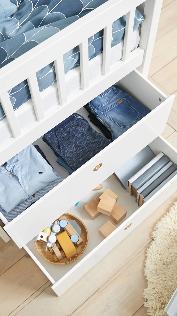 Med sin fina höga ben skapar den en lyxig känsla och en tidlös design som passar i alla typer av barnrum, eller andra rum också för den delen. På sängen framsida finns 4 rymliga förvaringslådor så att du enkelt kan stoppa undan barnets sängkläder, böcker och leksaker. Barnet kan klättra upp och ner själv tack vare den lilla stegen i mitten som också fungerar som en öppen hylla.