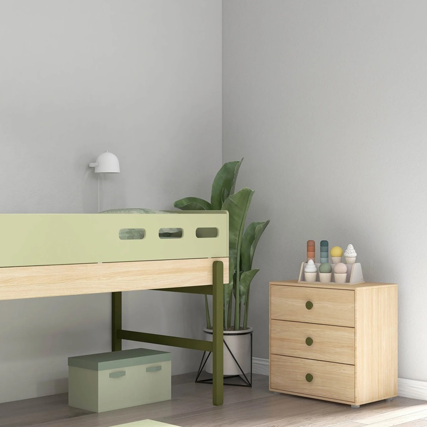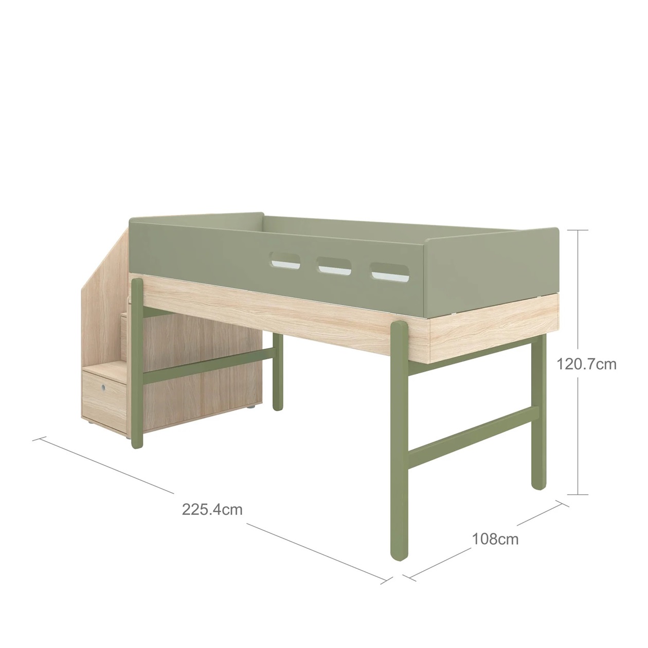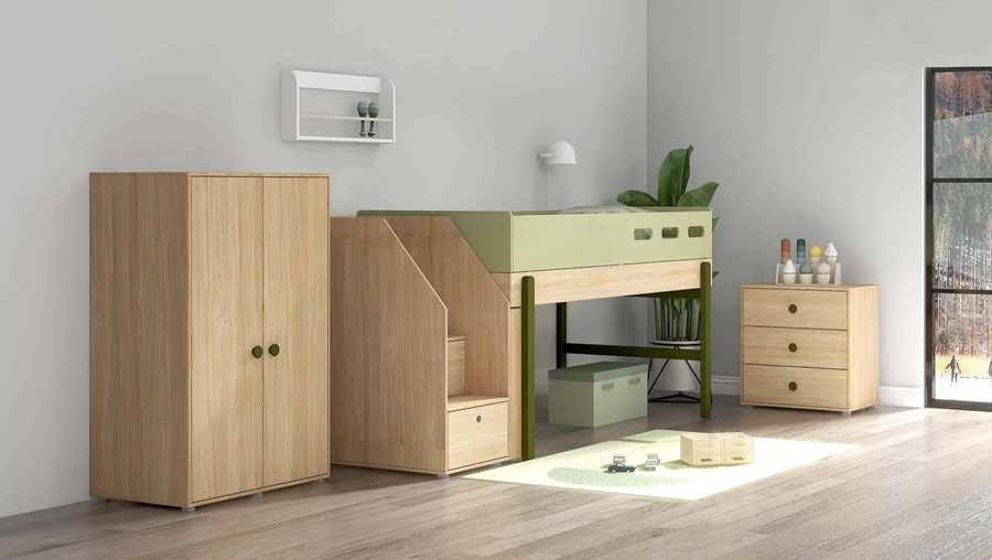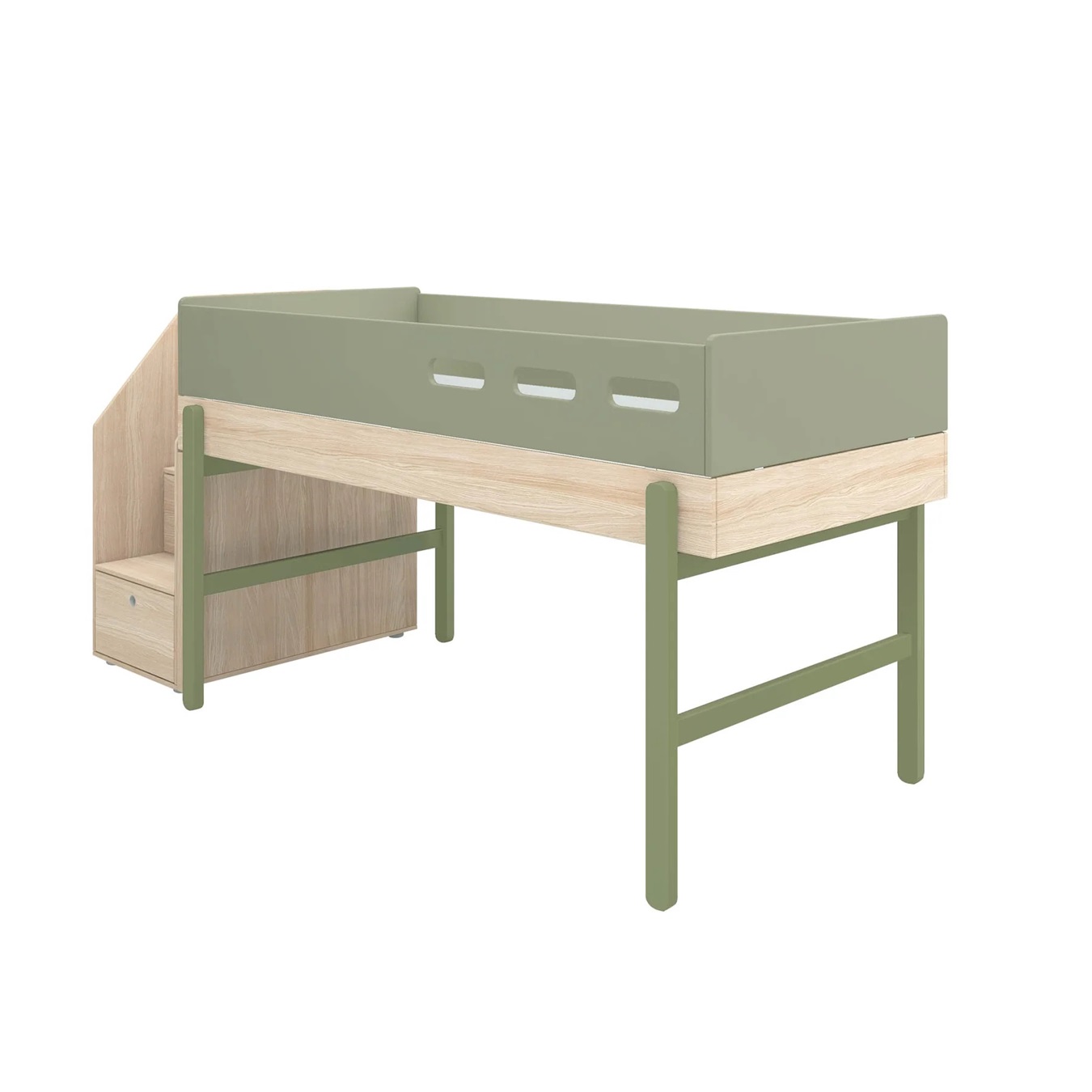 Flexa, låg loftsäng med trappa 90×200 cm Popsicle, kiwi oak
