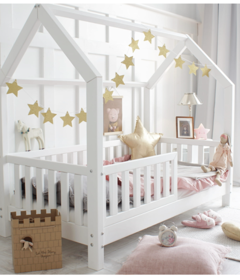 En säng i skandinavisk stilren stil som passar överallt och i alla typer av rum. Du kan enkelt dekorera den med fina vimplar eller ljusslingor för att få mer effekt.