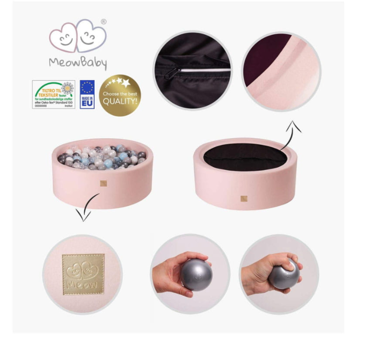 Ett härligt bollhav i sammet från Meow!Meows bollhav kommer i en mängd olika varianter, hitta just din favorit och säkra många roliga stunder tillsammans med ditt barn.Mått:Diameter: 90 cmHöjd: 30 cmTjocklek kant: 5 cmBollar: 7 cmBollar i detta paket:Beige, pärlvit och transparent200 CE-märkta bollar ingårInfo: Överdrag: 100% sammetsmanchesterPool: 100% polyuretan skumBollar:…