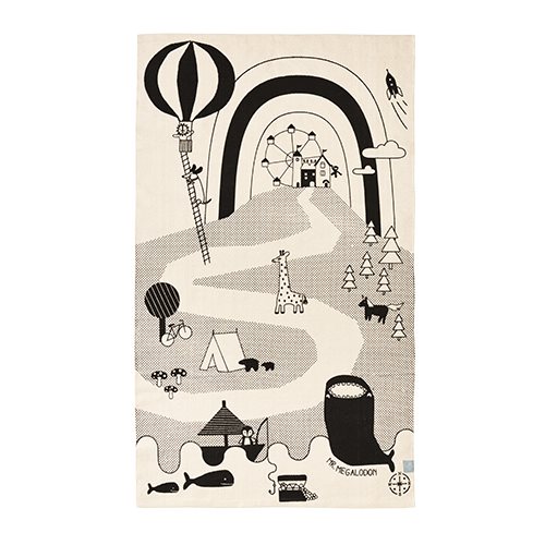Vi presenterar den fantastiska mattan ?Mr Megalodon Adventure Rug? från Oyoy. En vacker design i svartvitt, med ett fint mönster föreställande bl.a en regnbåge, en rymdraket och olika djur. Denna matta kommer att skapa en härlig känsla i barnrummet och tack vare det kraftigare bomullstyget så kommer den att ligga stadigt på golvet. Denna matta kan med fördel också hängas på väggen som en vacker dekoration i din barnrumsinredning.