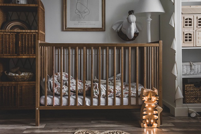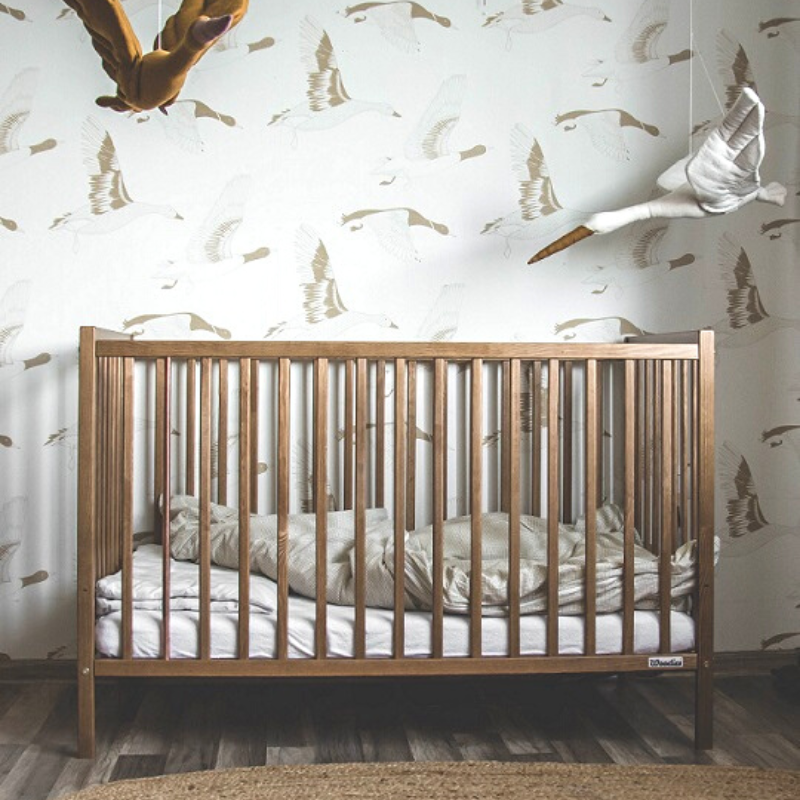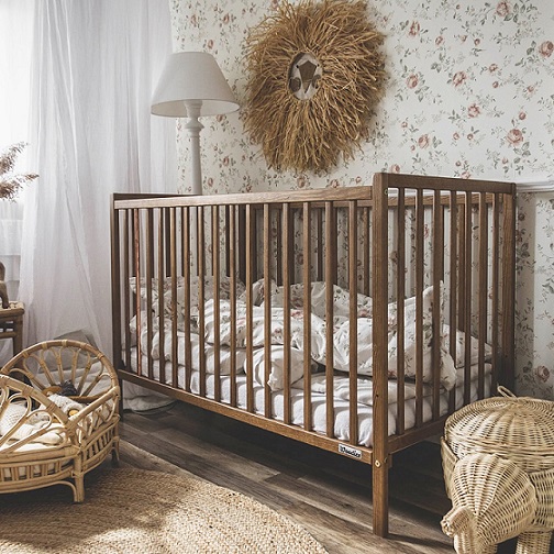 Klassisk valnötsfärgad spädbarnssäng som har tidlöst design och kommer att passa i varje barnrum.