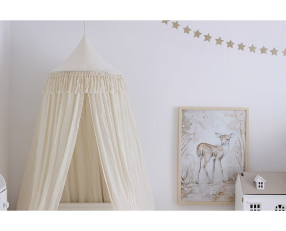 - Nu är det dags att hänga upp den, så sätt den på kroken och testa att den sitter bra. Har du sänghimlen över en säng, så kan du enkelt stoppa ner ena sidan bakom sängen för att få det fint. Känns den för lång så kolla om du kan anpassa längden med hjälp med öglan.